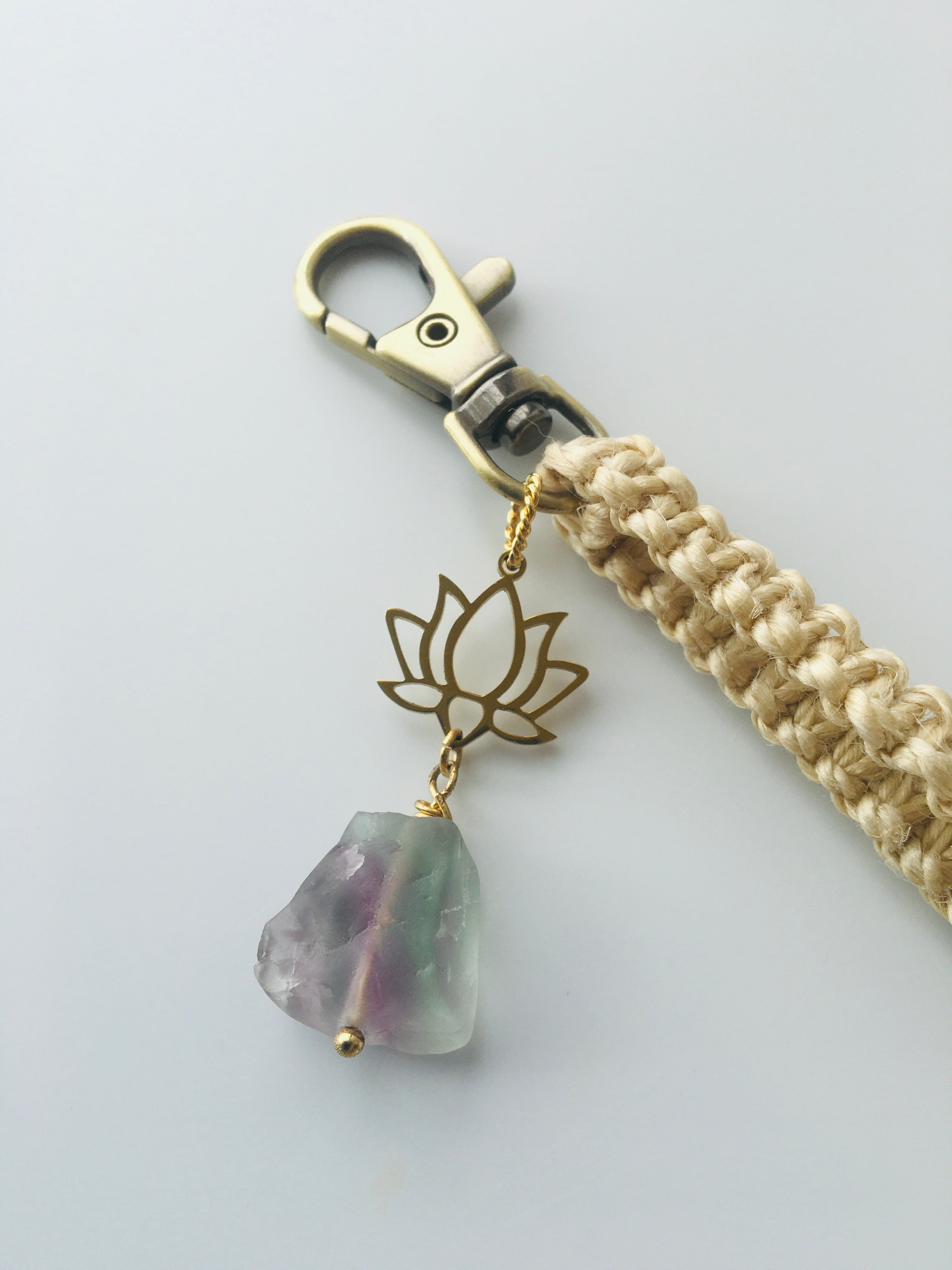 こちらの商品は、国産100%精麻と天然石のフローライト、SATYAの象徴である蓮の花のチャームを付けた長さ12㎝のストラップになっております。