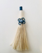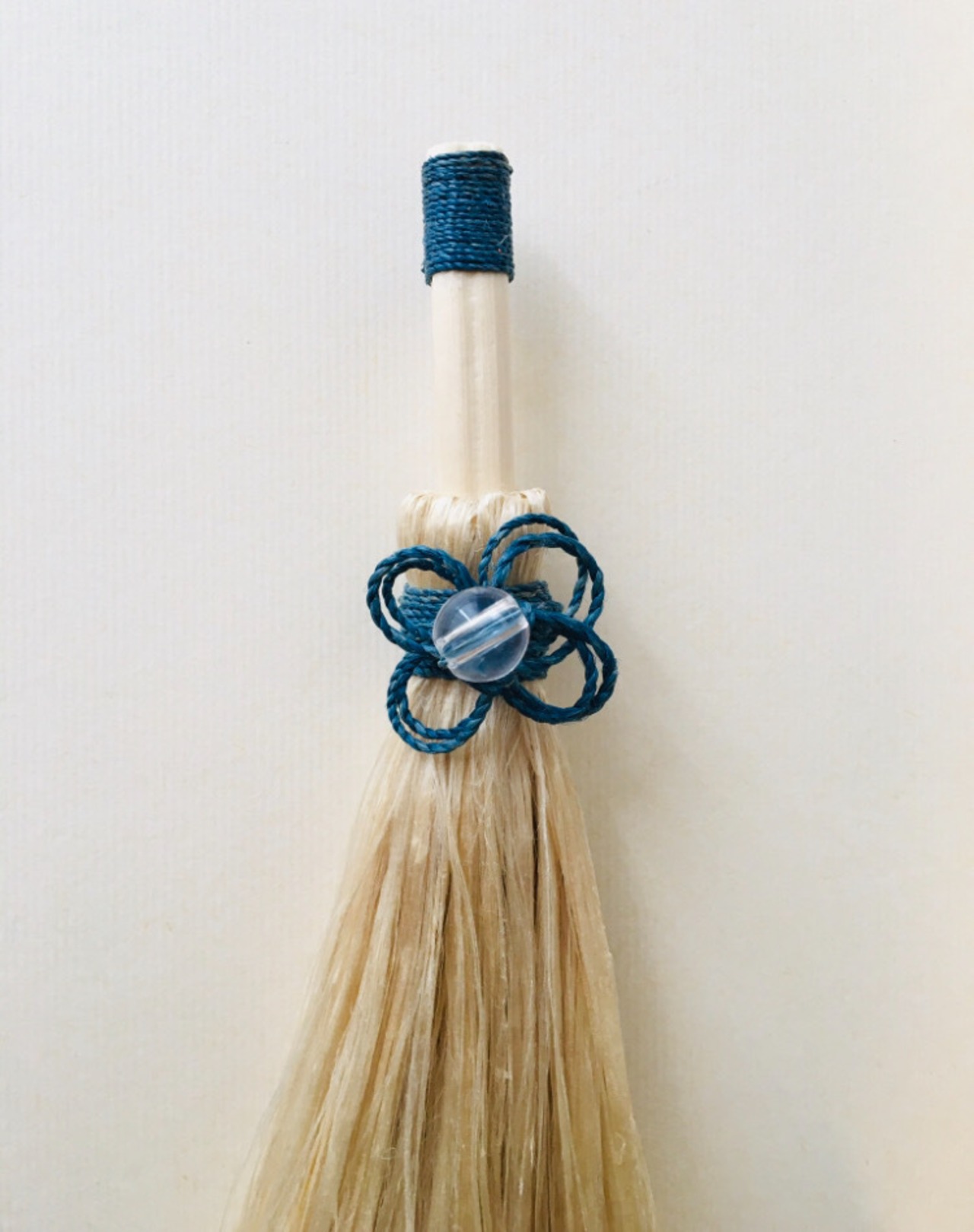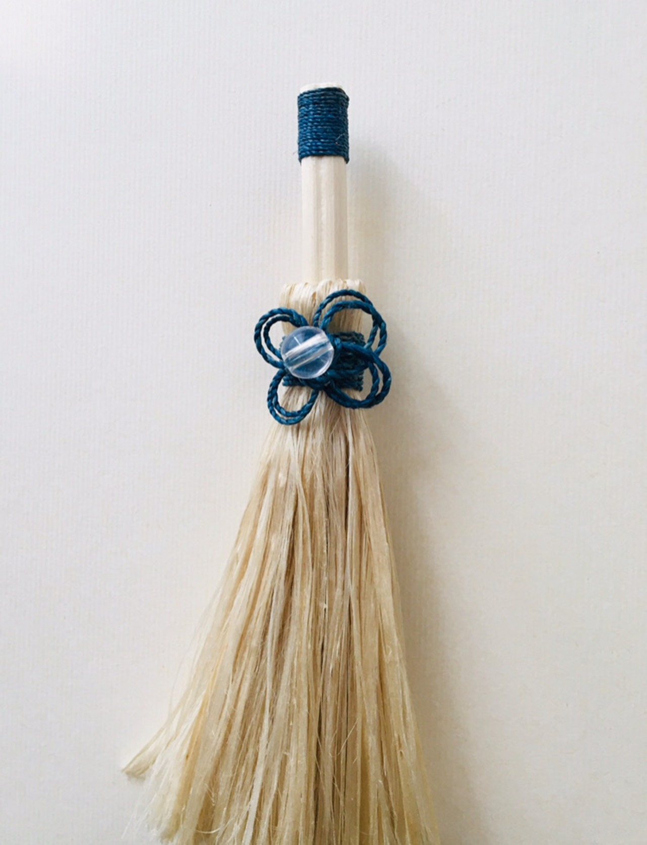 こちらの商品は、国産100%の藍染め精麻に、天然石のグレードAAA水晶と四つ葉のクローバーをあしらったほうきです。持ち手には麻がらを使用し、自然のエネルギーと神聖な力を宿しています。
