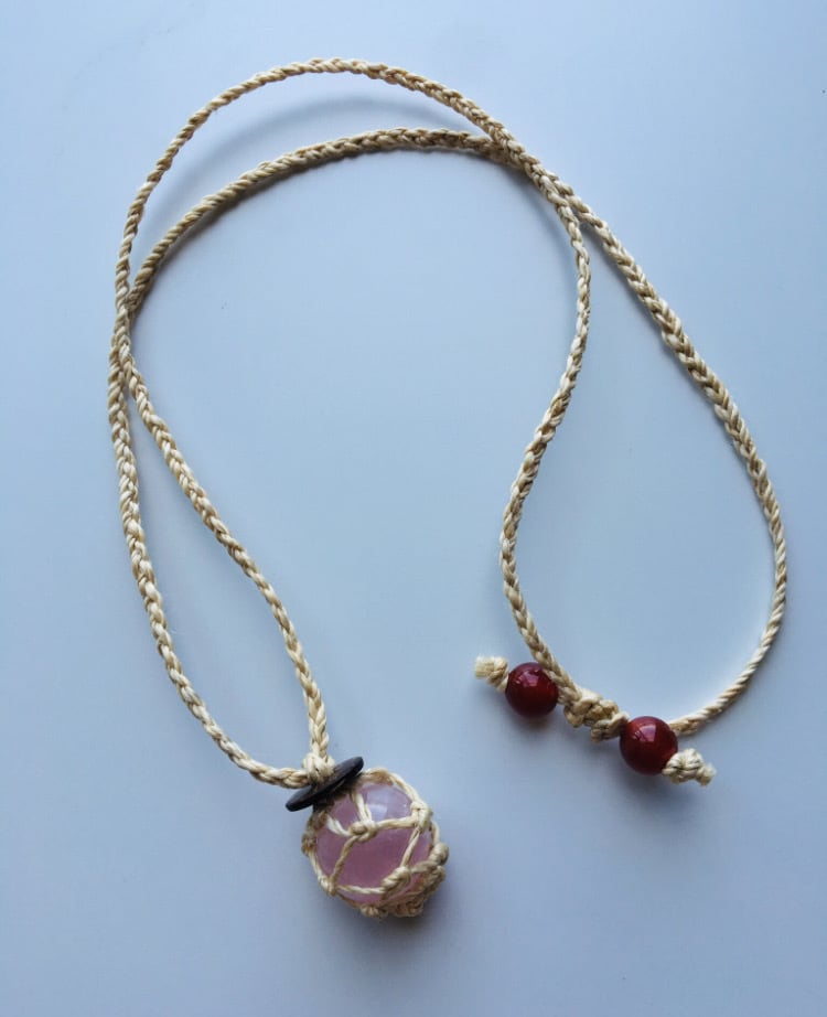 こちらの商品は、国産100%の精麻を使用し、ローズクォーツを包み込んだ石包みペンダントです。結び終わりには、活力を象徴する天然石カーネリアンをあしらいました。