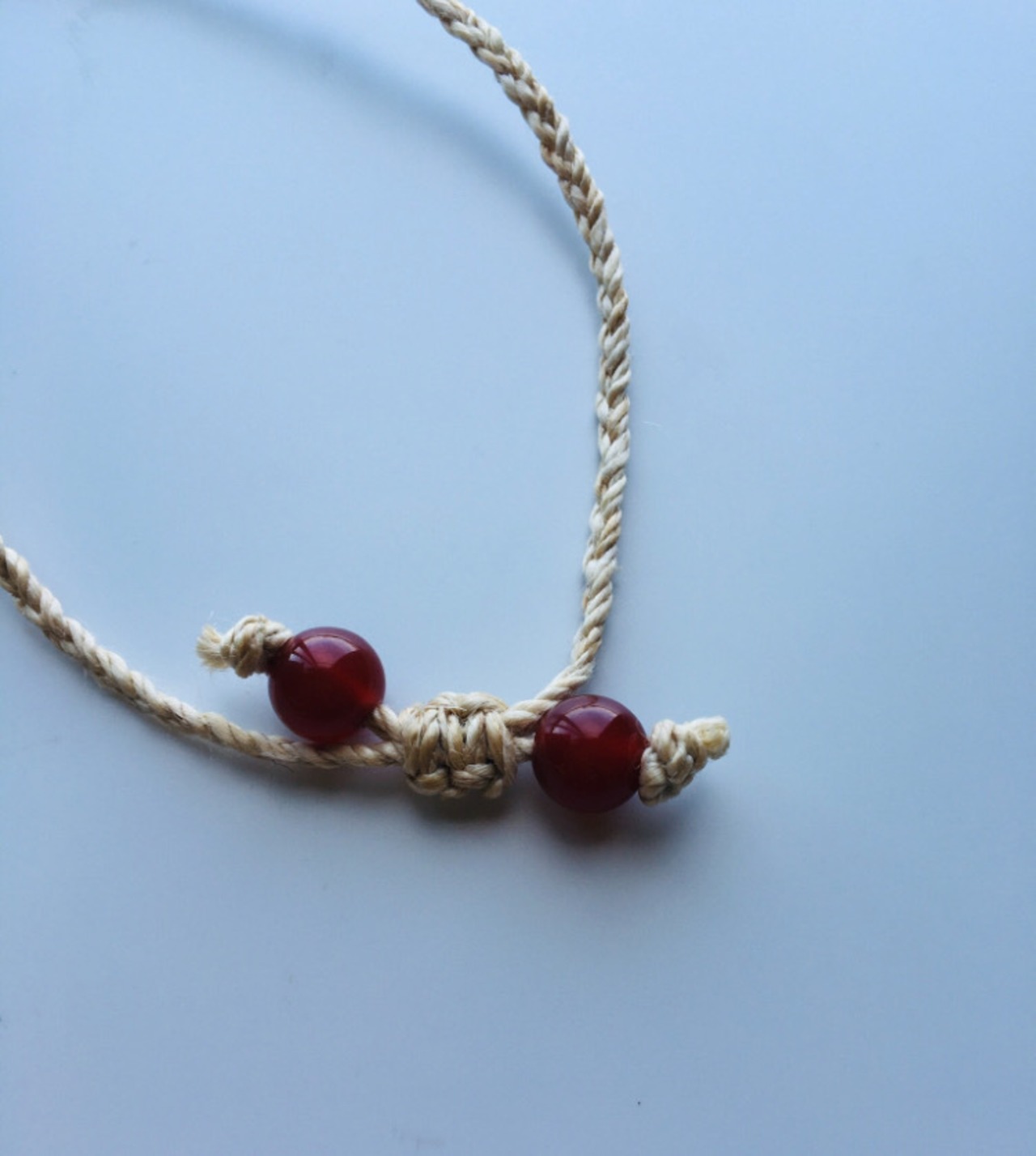精麻(せいま)、天然石ローズクォーツ、カーネリアン、ココナッツボタンを使用。