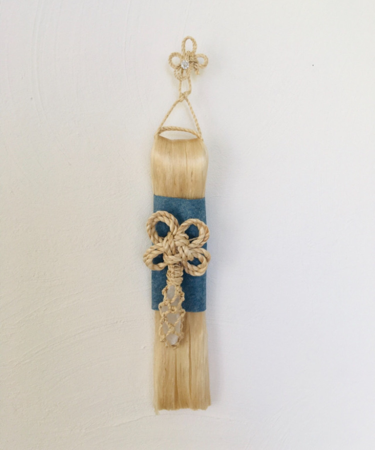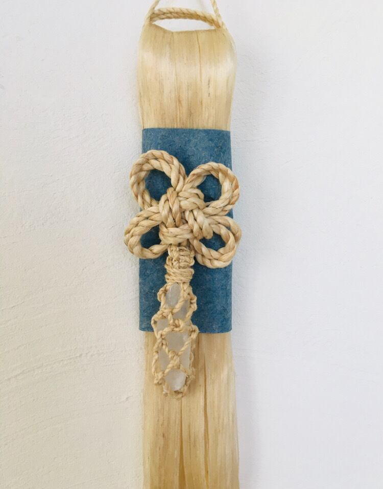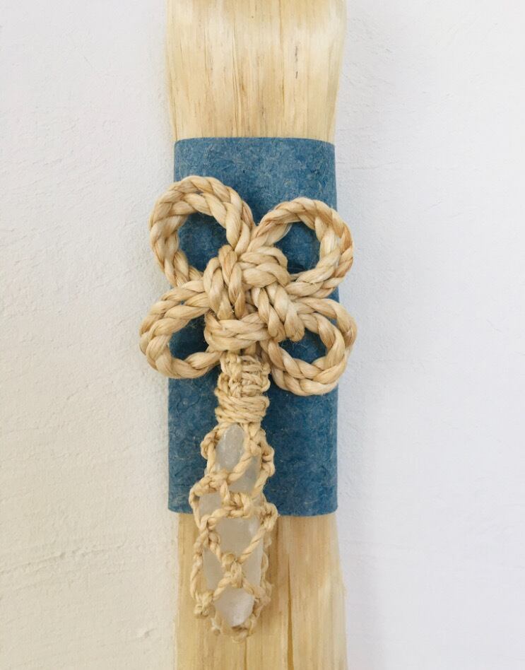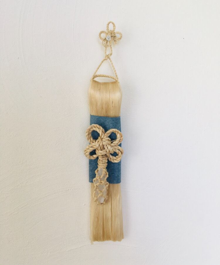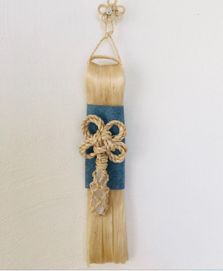 精麻(せいま)、天然石針水晶、藍染め麻紙を使用。