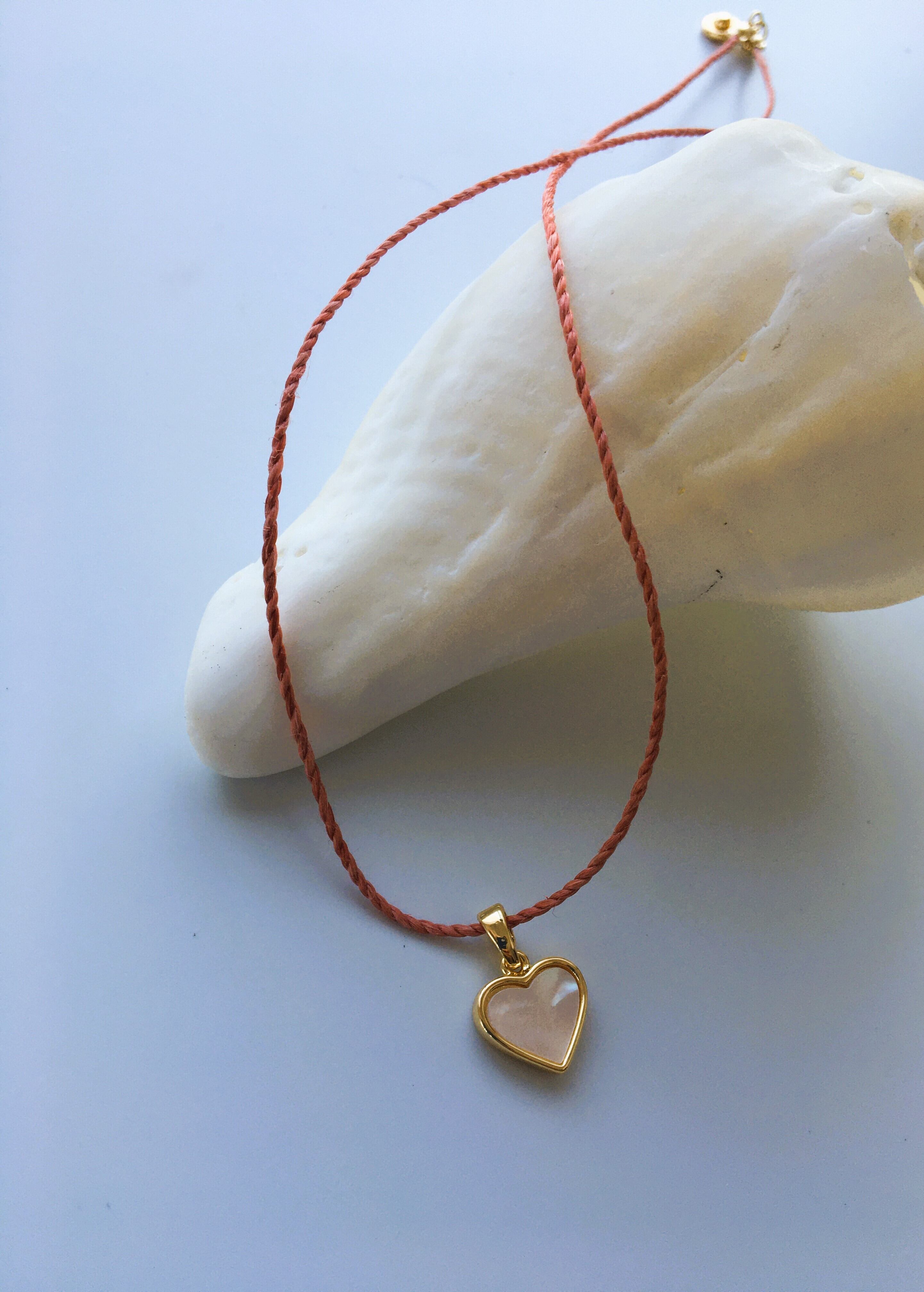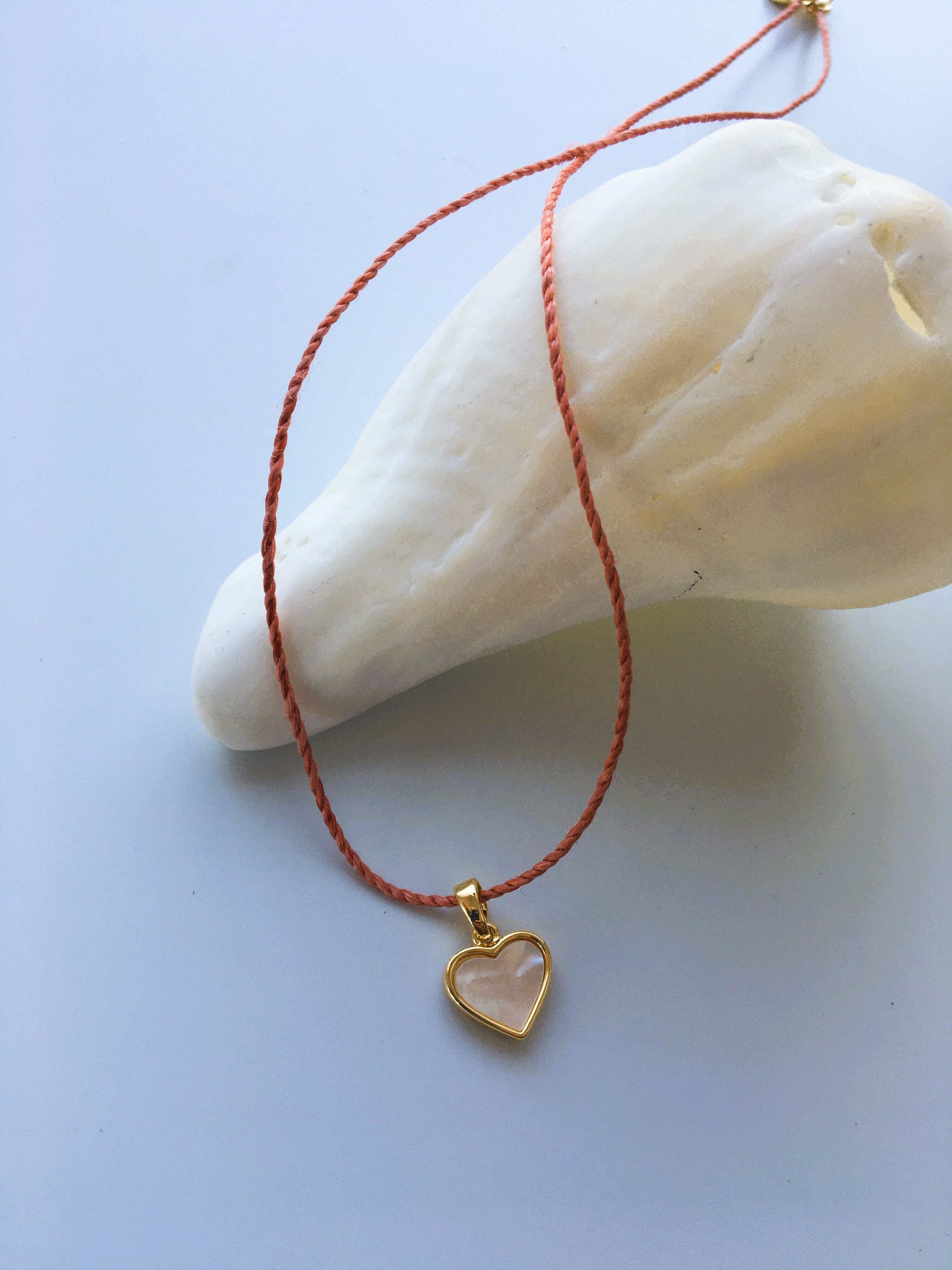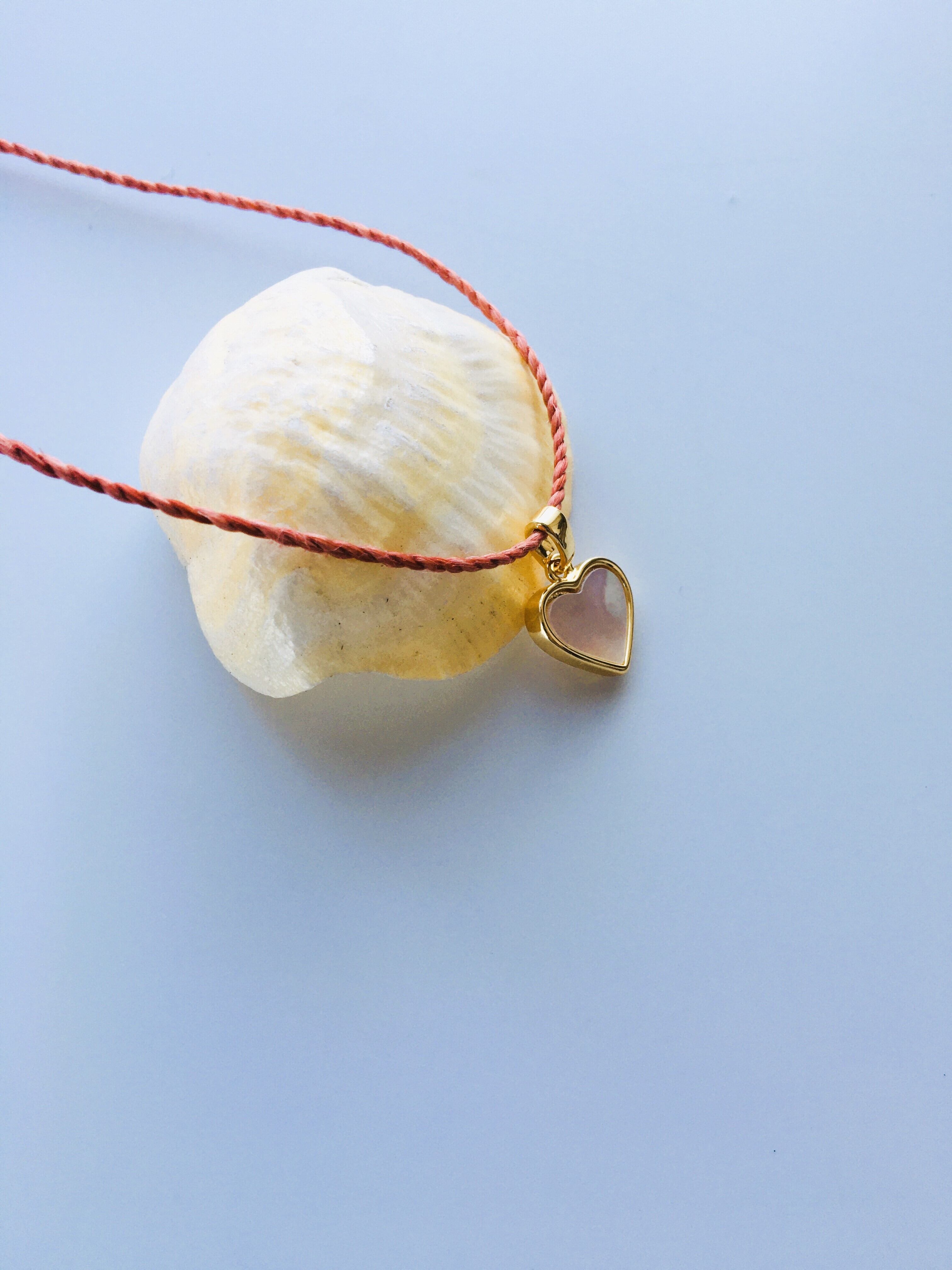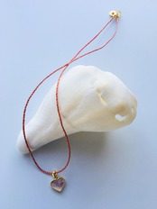 茜染めの精麻紐に、淡水シェルのハート型チャームを添えた、神聖で繊細なペンダントです。