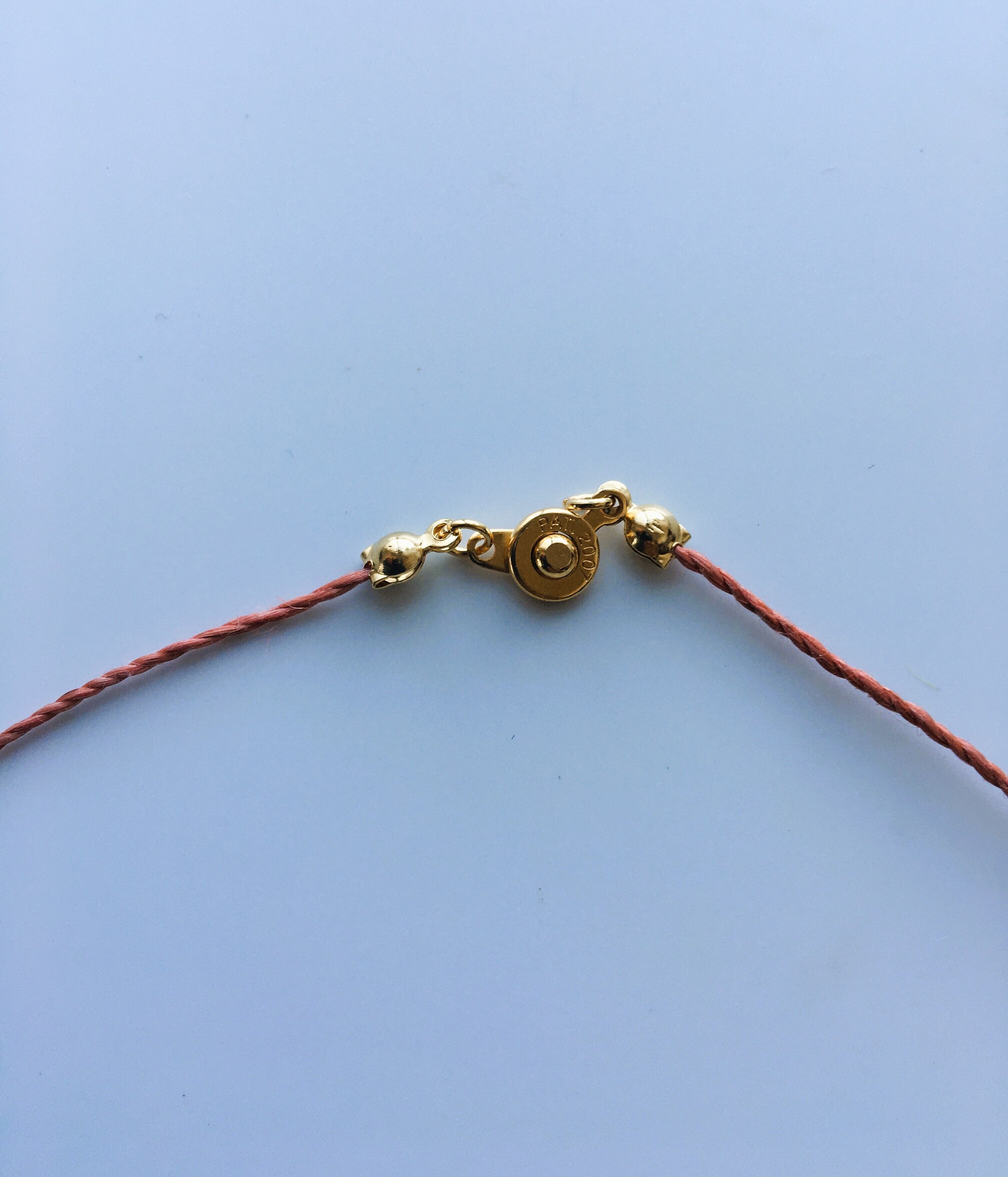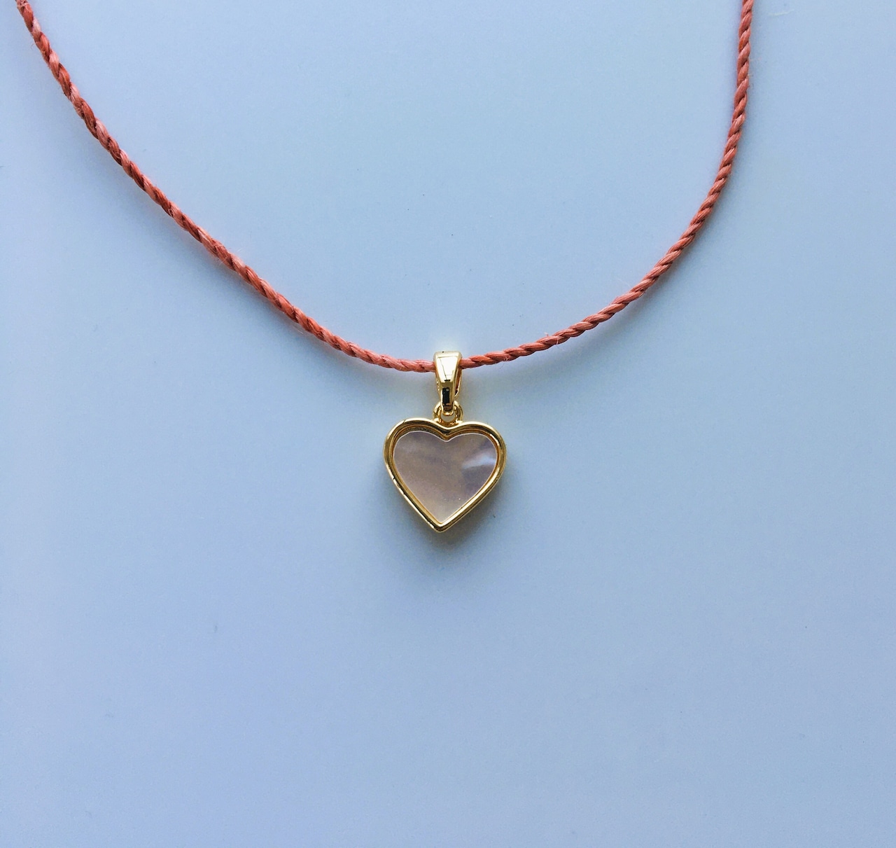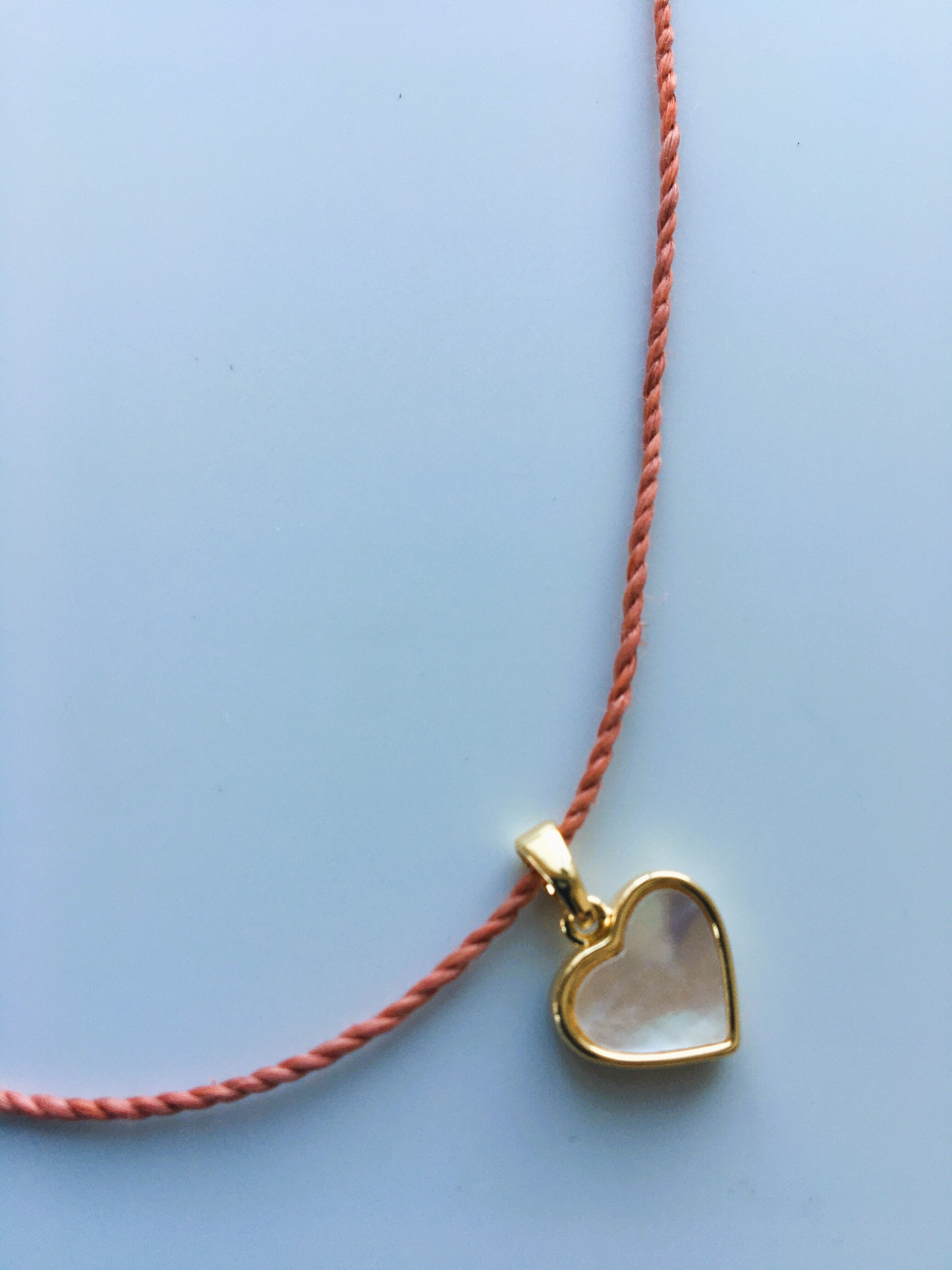 茜染めの精麻紐に、淡水シェルのハート型チャームを添えた、神聖で繊細なペンダントです。