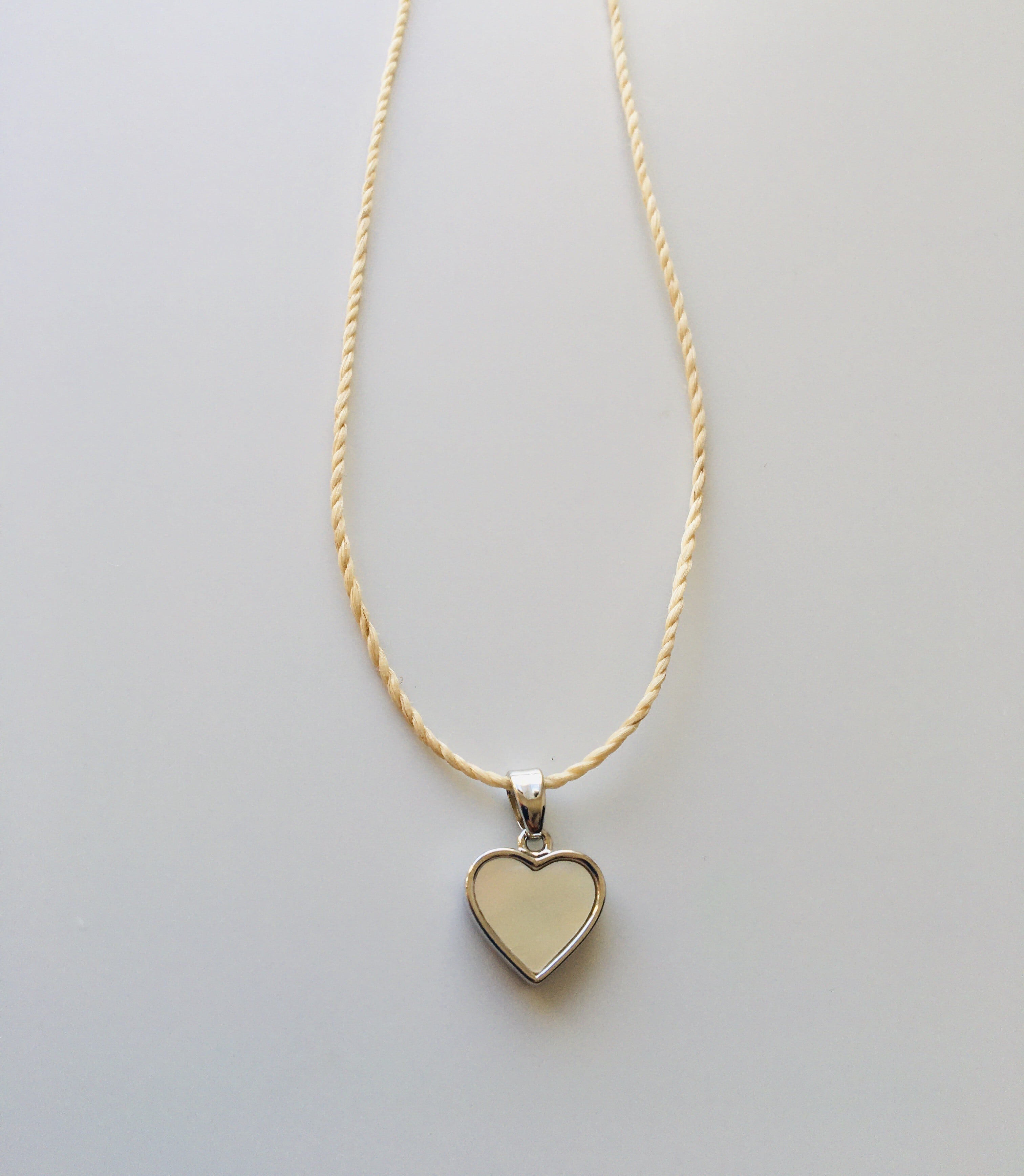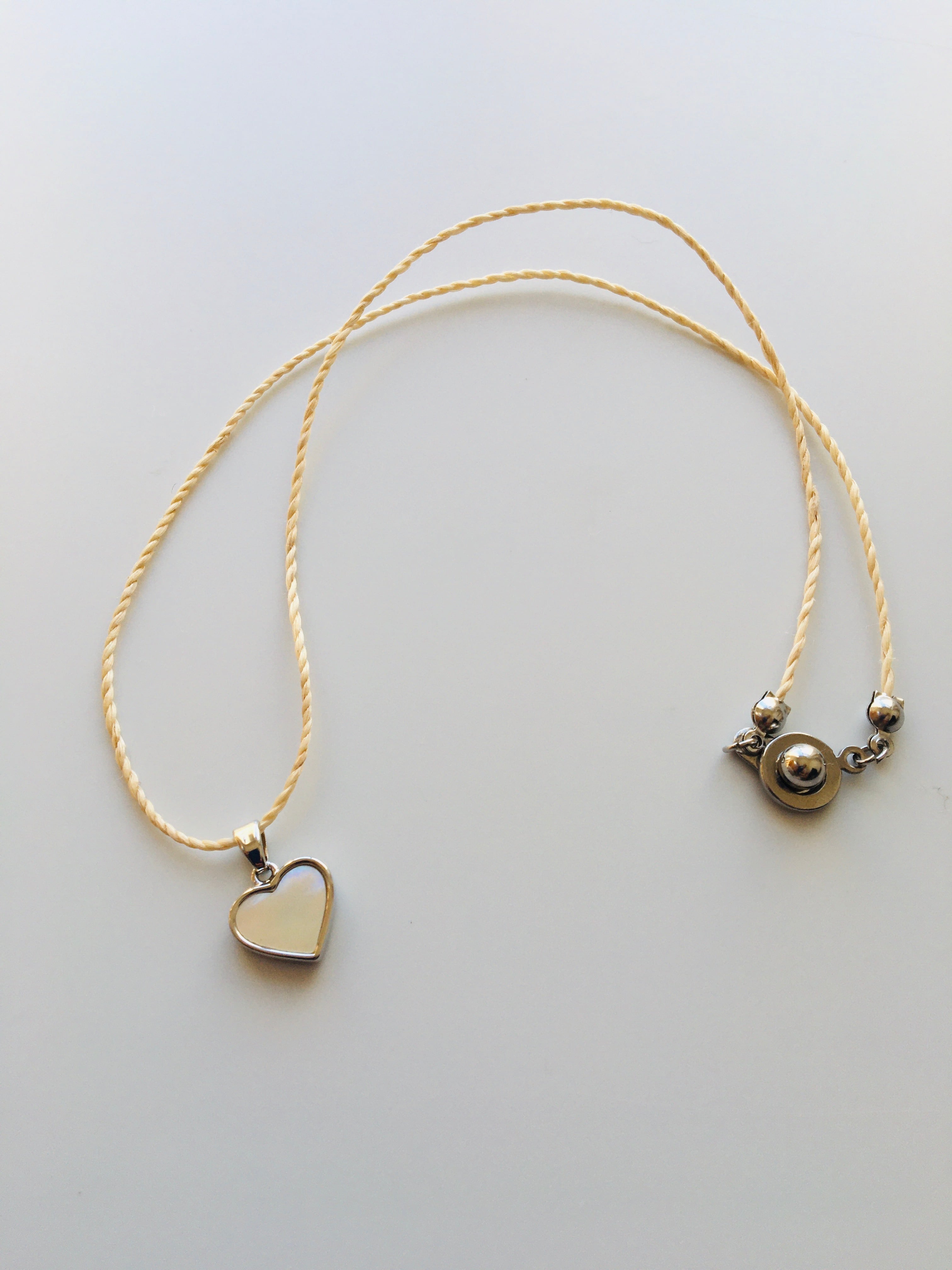 精麻の紐に、淡水シェルのハート型チャームを添えた、清らかで繊細なペンダントです。